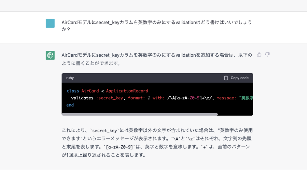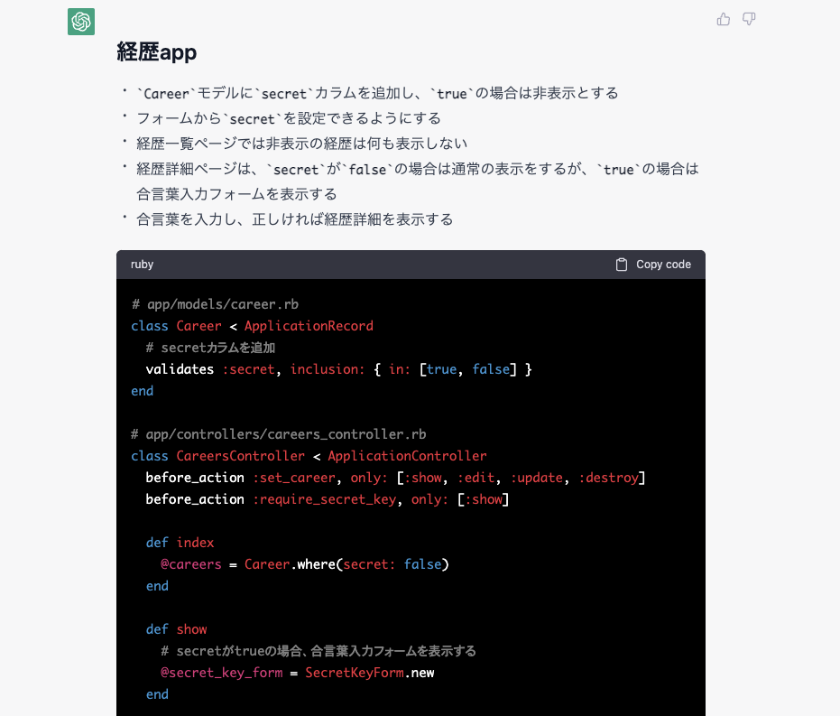 まずは上記の用件と仕様をもとに実装内容、コードを提案してと投げてみる。しかし、入れているgemの前提が違ったりうまく意図したコードが来なかった。これは当たり前でchatGPTにはgemや他の実装内容がわからないのでそことの整合性を取れない。