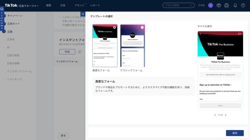 今回はLPなどに飛ばさずにインスタントフォームというtiktok上で申し込みができるフォームを使います。広告の画面から作成できます。