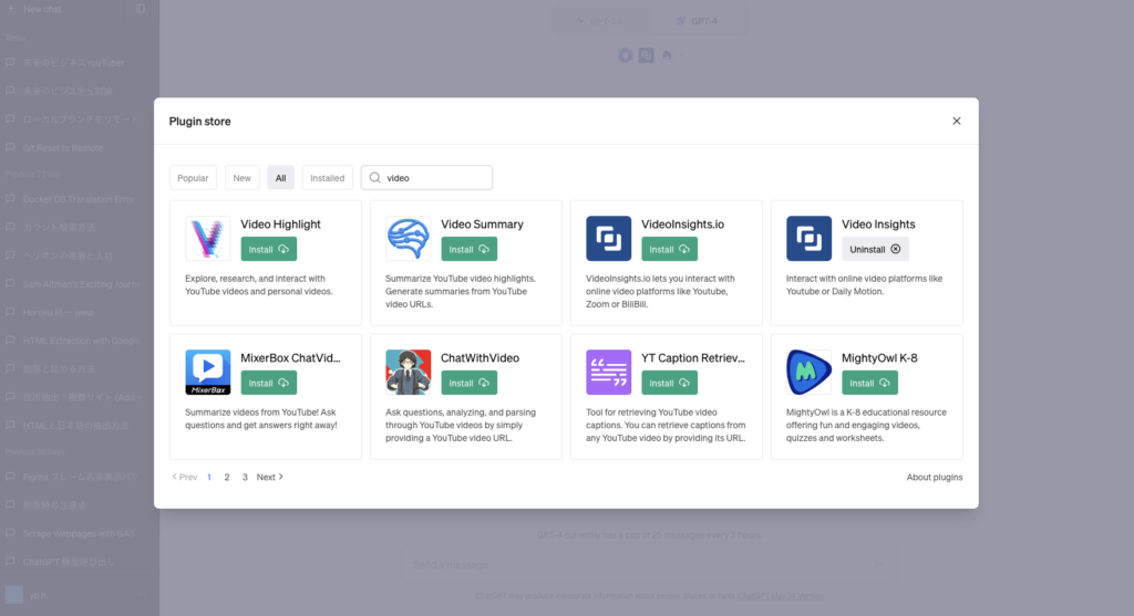 chatGPT自体にvideo insight.ioというプラグインがあり、youtubeなどのurlから動画の中身を参照できます。video insightもありますが、video insight.ioのほうが新しく、長い動画に対応しています。