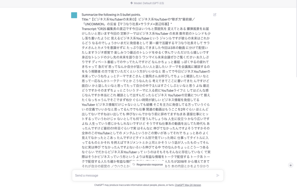 便利そうなんですが、動画のtransscript(文字起こし)をそのまま持ってきているのでちょっと長い動画だとすぐにtoken切れを起こします。