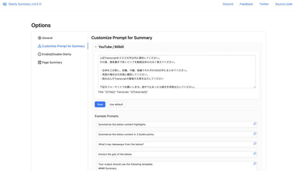 - Glarity:プロンプトをカスタマイズできるが、読み込めているのが途中まで