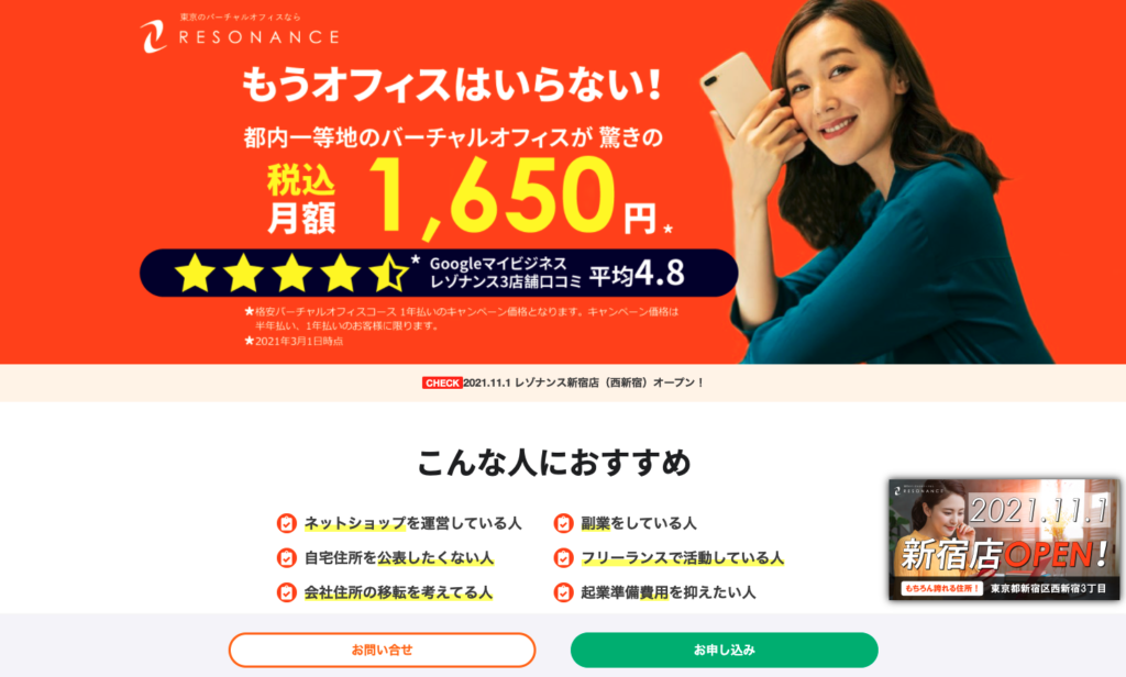 月額1650円!東京都内一等地のバーチャルオフィス【レゾナンス】