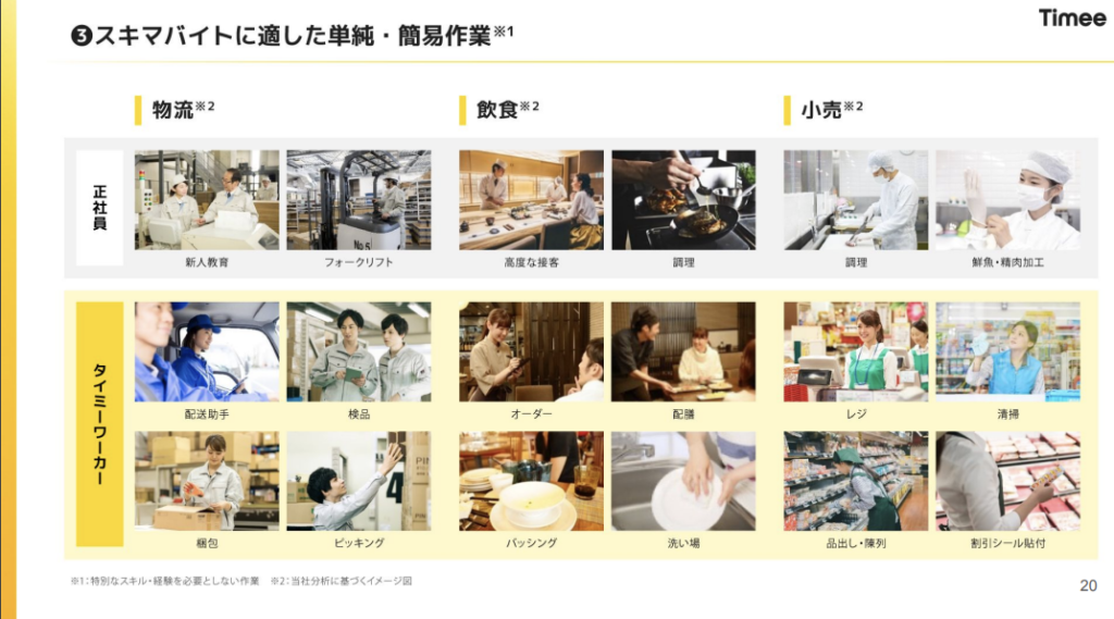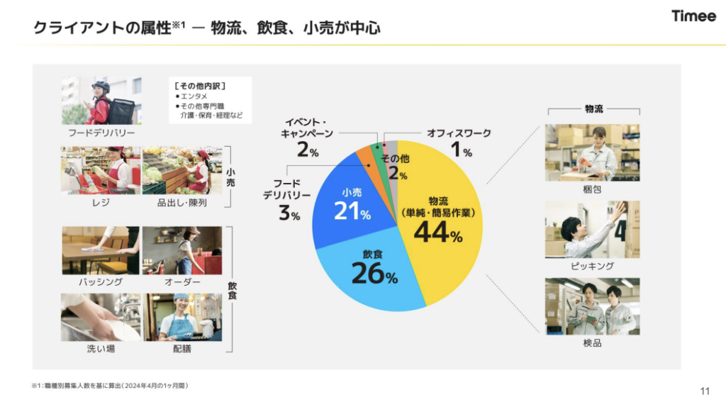 案件は物流、飲食、小売などがメイン。物流なんかは昔から日雇いバイトであったが飲食や小売は昔はバイトに空きが出たら必死にバイトに店長が声かけるみたいな状態だったと思うのでだいぶタイミーに助けられていそう。