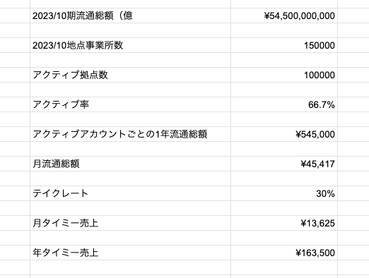 2023年10月期の数字で1年間で1拠点がどれくらい売り上げを上げるか計算したところだいたい54.5万ほどの流通額になった。テイクレートを計算しやすく30%とするとタイミーの売り上げは