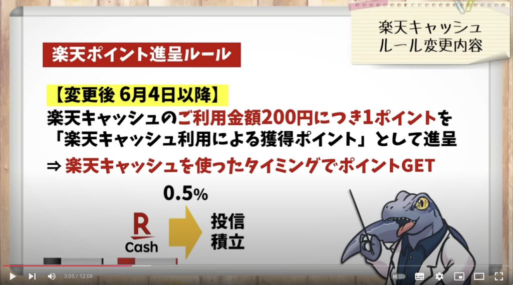 例えば還元を1.5%にしていたり、今まで楽天キャッシュ経由の証券への積立を楽天カードでチャージすることでポイント還元されていたのがカードからキャッシュへのチャージ時点ではなく、キャッシュから証券への積立時に還元されるようになりました。これにより楽天カード以外のカードで1%還元を受けてキャッシュから積み立てるようになり、カードからは離れるんですが、キャッシュでの積立がよりお得になりました。